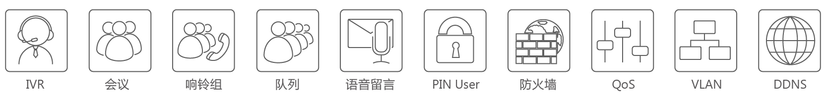 自動話務(wù)員 呼叫隊列 響鈴組 話機(jī)自動配置 黑名單 通話記錄 呼叫轉(zhuǎn)移 呼叫停泊 呼叫截答 呼叫路由 呼叫等待 呼叫跟隨 通話錄音(一鍵錄音) 來電顯示 電話會議 外轉(zhuǎn)外(DISA) 特色鈴聲 免打擾(DND) 防火墻 廣播/對講 等待音樂 PIN用戶(PIN碼控制) 結(jié)合Skype(Skype Connect) 三方通話 語音留言 傳真(T.38) 監(jiān)聽 靜態(tài)路由 按名字撥號 移動分機(jī) 速撥碼 支持VPN(OpenVPN) 多國語言系統(tǒng)提示音 短信功能 MyTwins(雙系統(tǒng)備份技術(shù)) *TR069