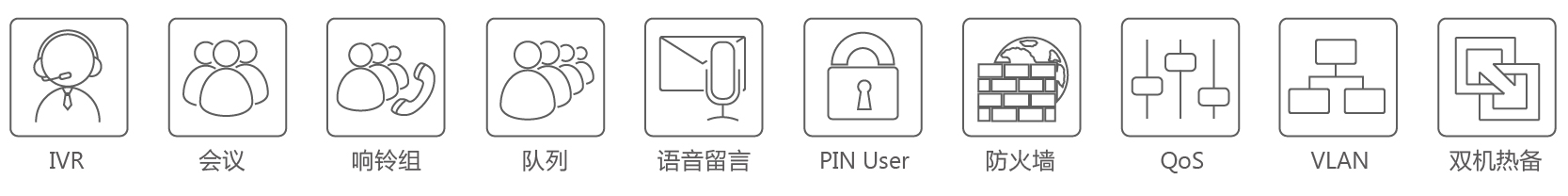 自動話務(wù)員 響鈴組 呼叫隊列 話機自動配置 黑名單 通話記錄 呼叫轉(zhuǎn)移 呼叫停泊 呼叫截答 呼叫路由 呼叫等待 呼叫跟隨 通話錄音(一鍵錄音) 來電顯示 電話會議 外轉(zhuǎn)外(DISA) 特色鈴聲 免打擾(DND) 防火墻 廣播/對講 等待音樂 PIN用戶(PIN碼控制) 結(jié)合Skype(Skype for SIP) 三方通話 語音留言 傳真(T.38) 回?fù)?/td> 監(jiān)聽 支持VPN(OpenVPN) 雙機熱備 MyTwins(雙系統(tǒng)備份技術(shù)) 多國語言系統(tǒng)提示音