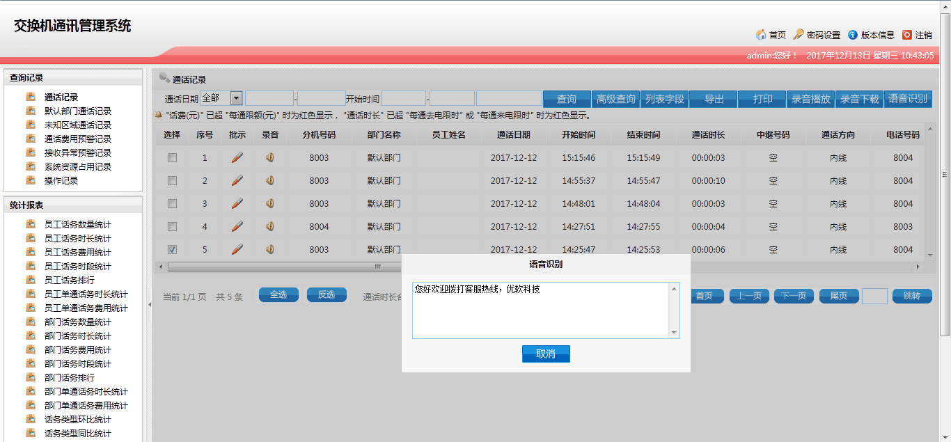 ● 會議式錄音,內(nèi)外線均可錄制● 網(wǎng)絡(luò)架構(gòu)不受限制,無需鏡像抓包● 錄音分機(jī)/中繼類型不限● 無需購買工控機(jī)及語音卡● SIP中繼對接,通訊穩(wěn)定并發(fā)量大● 支持B/S網(wǎng)頁錄音查聽,多條件查詢軟件界面