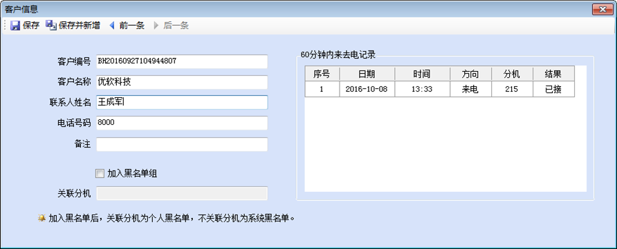 ● 外部電話呼入,可智能轉(zhuǎn)接到上次通話的分機(jī)● 前臺客戶端可來電彈屏、黑名單客戶管理● 能與客戶業(yè)務(wù)系統(tǒng)集成,數(shù)據(jù)實時交互● 支持SIP中繼對接,通訊穩(wěn)定,且并發(fā)量大軟件界面