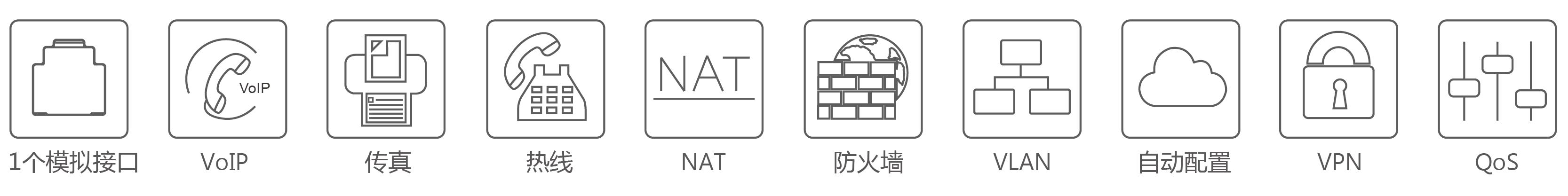 三方通話 咨詢轉 盲轉 呼叫保持 呼叫詳細記錄 呼叫前轉 來電顯示 呼叫等待 IP直撥 特色響鈴 免打擾 撥號規(guī)則 熱線功能 信息等待指示燈(MWI) 速撥