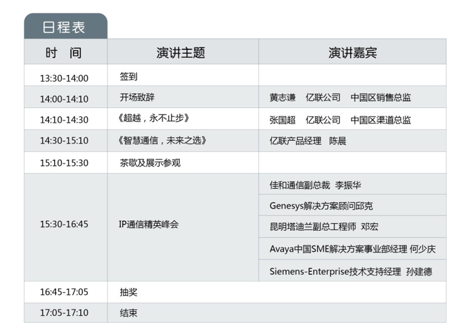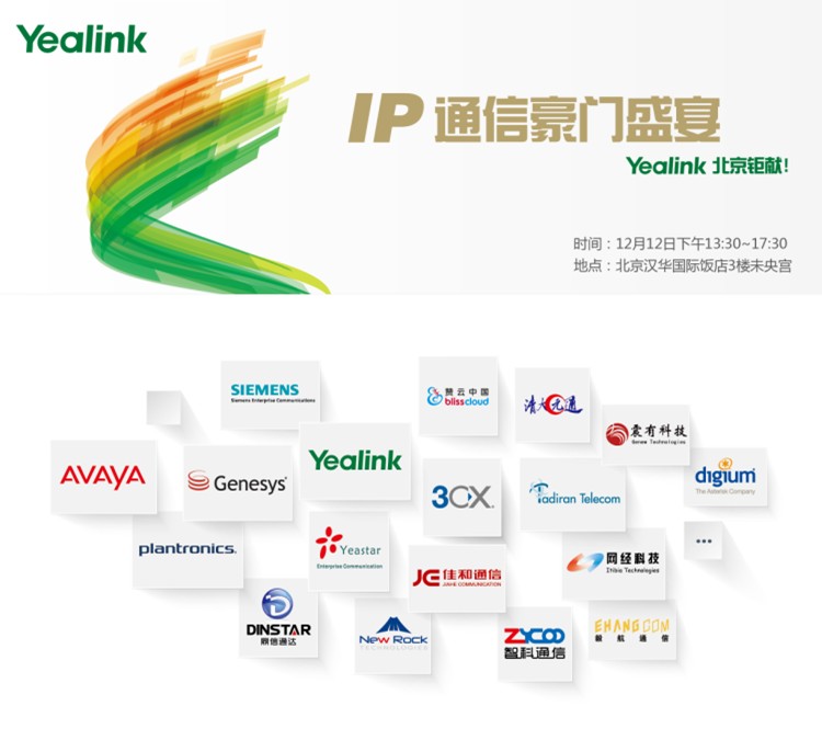 2013年12月12日,全球TOP3 SIP話機(jī)提供商——億聯(lián)公司(Yealink)將攜手AVAYA、Genesys、佳和通信、西門(mén)子、塔迪蘭、3CX、贊云中國(guó)、Digium、鼎信通 達(dá)、毅航通信、震有科技、網(wǎng)經(jīng)科技、迅時(shí)通信、Plantronics、清大元通、億群、智科通信等十余家業(yè)內(nèi)頂級(jí)廠商,在北京漢華國(guó)際飯店3樓未央宮共 同獻(xiàn)上一場(chǎng)IP通信豪門(mén)盛宴,帶領(lǐng)大家感受新時(shí)代通信科技的脈搏,掌握企業(yè)核心競(jìng)爭(zhēng)優(yōu)勢(shì)。