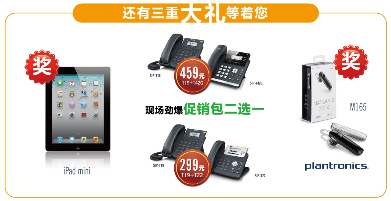 2、 億聯(lián)話機(jī)現(xiàn)場(chǎng)勁爆促銷(xiāo)包:為來(lái)賓準(zhǔn)備了兩套促銷(xiāo)方案,只需簡(jiǎn)單現(xiàn)場(chǎng)登記,就能以前所未有的優(yōu)惠價(jià)拿到T42G+T19(459元)或T22+T19(299元)。