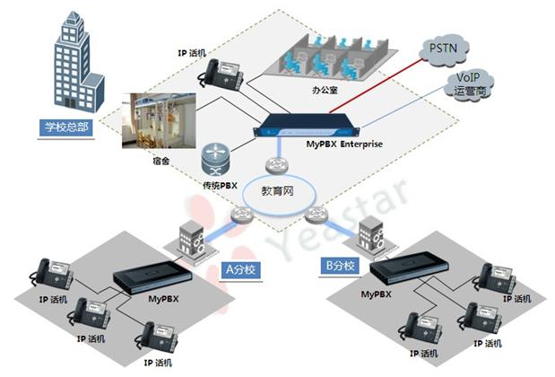 2)通過MyPBX組建校園IP集團電話系統(tǒng),不但同地校區(qū)內的所有分機互打免費,異地分校區(qū)之間的所有分機也可免費互聯(lián)。