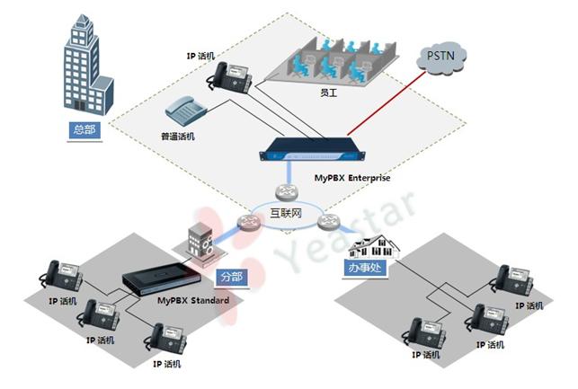• 部署一臺(tái)MyPBX Standard(100用戶數(shù))或MyPBX SOHO(30用戶數(shù)), 通過(guò)互聯(lián)網(wǎng)與總部MyPBX Enterprise相連。