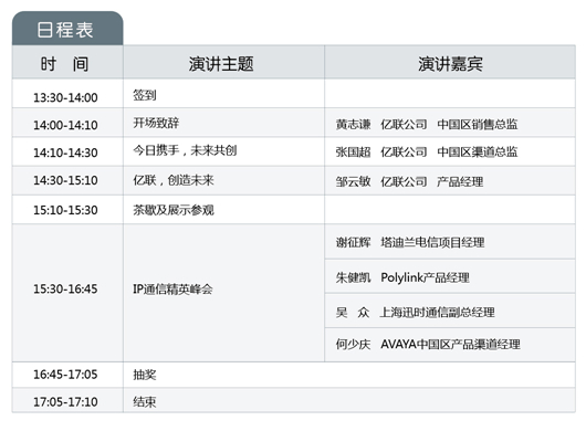 屆時,塔迪蘭電信項目經(jīng)理謝征輝、AVAYA中國區(qū)產(chǎn)品渠道經(jīng)理何少慶、上海迅時通信副總經(jīng)理吳眾、Polylink產(chǎn)品經(jīng)理朱健凱等業(yè)界精英,還將為來賓帶來一場IP通信精英峰會。屆時將有哪些前沿信息的分享、哪些頭腦風暴的碰撞,讓我們拭目以待。