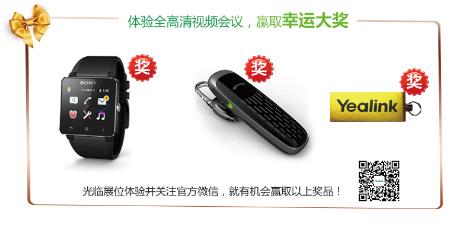 為了通過此次展會讓更多的人了解全高清視頻會議系統(tǒng),億聯(lián)VC系列全高清視頻會議系統(tǒng)將全面亮相此次展會。同時,億聯(lián)公司還為到場客戶準(zhǔn)備了幸運大獎�,F(xiàn)場體驗億聯(lián)全高清視頻會議系統(tǒng)的客戶,將有機(jī)會贏取新款索尼智能手表。關(guān)注億聯(lián)微信公眾賬號(Yealink),參與現(xiàn)場互動的客戶,還將贏取繽特力藍(lán)牙耳機(jī)等幸運獎品。
